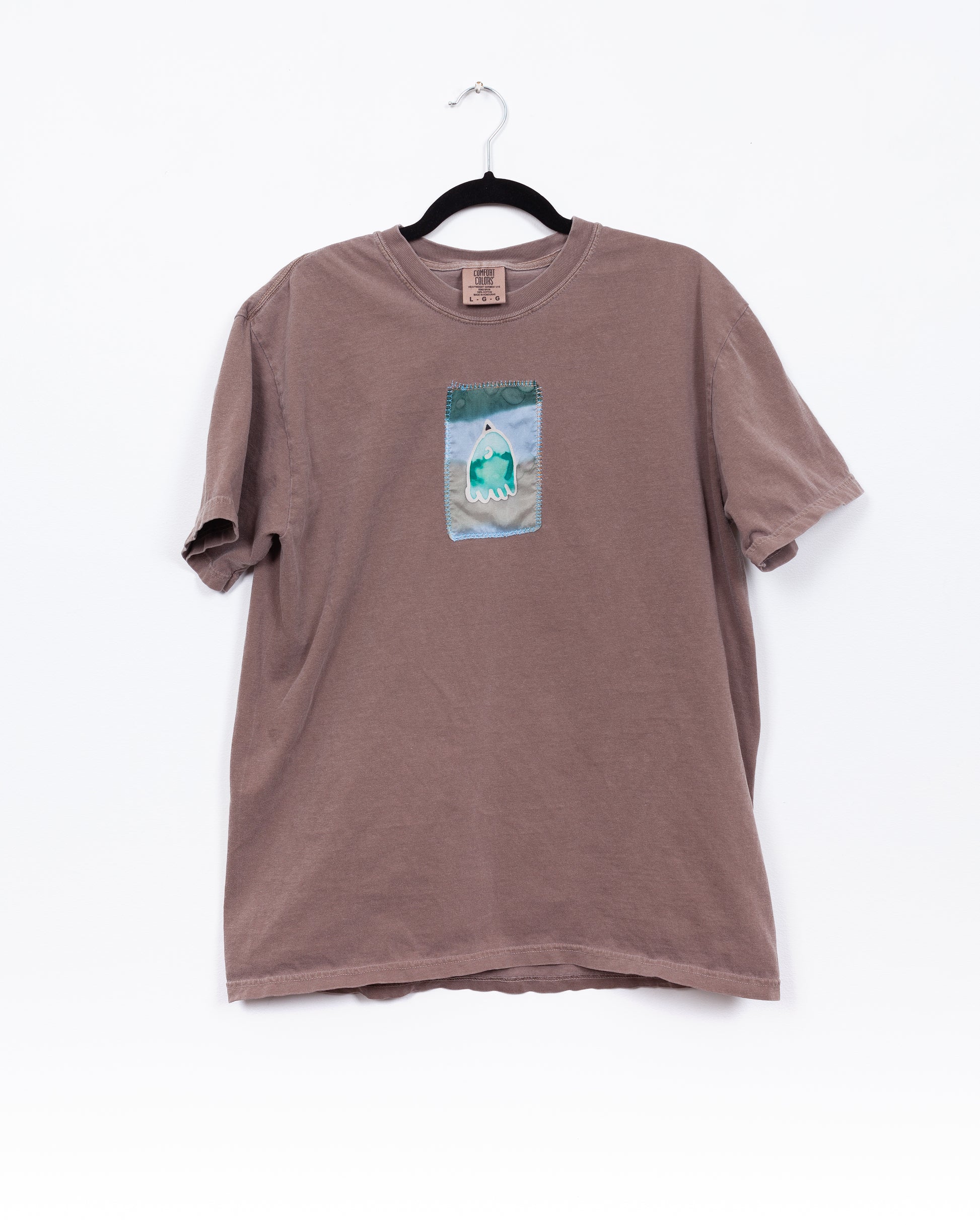 Each Patch-T is sourced new and adorned with a patch that is hand dyed in the garden behind my home. You can expect unique variation on thread color with multiple sometimes being used. Additionally, patches are intentionally applied with variations on tilt and center.